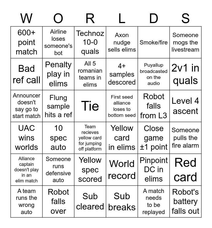This bingo card has 36 words: UAC wins worlds, 10 spec auto, Sub cleared, 4+ samples descored, Robot falls from L3, Level 4 ascent, 600+ point match, Robot falls over, Technoz 10-0 quals, World record, Puyallup broadcasted on the audio, Someone mogs the livestream, Alliance captain doesn't play in an elim match, Flung sample hits a ref, All 5 romanian teams in elims, Axon nudge sells elims, Pinpoint DC in elims, Someone pulls the fire alarm, Bad ref call, Penalty play in elims, Team recieves yellow card for jumping off platform, Yellow card in elims, Close game ±1 point, Red card, Announcer doesn't say go to start match, Airline loses someone's bot, Tie, Sub breaks, Smoke/fire, 2v1 in quals, A team runs the wrong auto, Someone runs defensive auto, Yellow spec scored, First seed alliance loses to bottom seed, A match needs to be replayed and Robot's battery falls out.