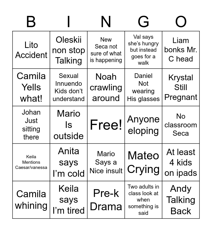 This bingo card has a free space and 24 words: Anita says I’m cold, Keila says I’m tired, Noah crawling around, Camila whining, Liam bonks Mr. C head, Lito Accident, Camila Yells what!, Oleskii non stop Talking, Anyone eloping, Mario Says a Nice insult, Daniel Not wearing His glasses, Johan Just sitting there, Mateo Crying, At least 4 kids on ipads, Sexual Innuendo Kids don’t understand, Two adults in class look at when something is said, No classroom Seca, New Seca not sure of what is happening, Krystal Still Pregnant, Mario Is outside, Andy Talking Back, Keila Mentions Caesar/vanessa, Val says she’s hungry but instead goes for a walk and Pre-k Drama.