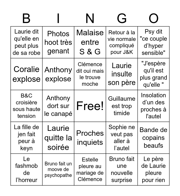 This bingo card has a free space and 24 words: Laurie quitte la soirée, Bruno fait un moove de psychopathe, Clémence dit oui mais le trouve moche, Le fashmob de l’horreur, Psy dit "ce couple d’hyper sensible", Laurie dit qu'elle en peut plus de sa robe, Coralie explose, Photos hoot très genant, Guillaume est trop timide, Proches inquiets, Laurie insulte son père, B&C croisière sous haute tension, Sophie ne veut pas aller à l’autel, Bande de copains beaufs, Anthony explose, Bruno fait une nouvelle surprise, Insolation d’un des proches à l'autel, Malaise entre S & G, "J'espère qu'il est plus grand qu'elle ", Anthony dort sur le canapé, Le père de Laurie pleure pour rien, La fille de jen fait peur à keyn, Retour à la vie normale compliqué pour J&K and Estelle pleure au mariage de Clémence.