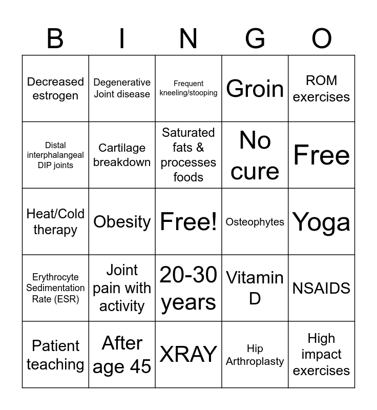 This bingo card has a free space and 25 words: Joint pain with activity, XRAY, Saturated fats & processes foods, Patient teaching, ROM exercises, Decreased estrogen, Distal interphalangeal DIP joints, Degenerative Joint disease, Osteophytes, 20-30 years, No cure, Heat/Cold therapy, Vitamin D, NSAIDS, Cartilage breakdown, Crepitation, Yoga, Frequent kneeling/stooping, Free, Obesity, High impact exercises, After age 45, Erythrocyte Sedimentation Rate (ESR), Groin and Hip Arthroplasty.
