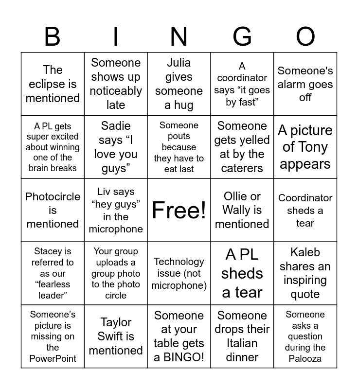This bingo card has a free space and 69 words: Suprise Jacob Steele appearance, Coordinator sheds a tear, Caiti sheds a tear, Tori gets emotional, Taylor Swift is mentioned, Microphone stops working, A coordinator says “it goes by fast”, Coordinator speech goes over time, Someone's alarm goes off, Someone doesn't dress up, Kaleb shares an inspiring quote, Jayla says “my Shayla”, The eclipse is mentioned, Julia gives someone a hug, Isabella gives one of her PLs a hug, Liv says “hey guys” in the microphone, Technology issue (not microphone), Someone gets yelled at by the caterers, Stacey is referred to as “the queen”, Stacey is referred to as our “fearless leader”, Ollie or Wally is mentioned, A PL sheds a tear, A picture of Tony appears, March Madness is mentioned, EOS reminders are mentioned, Abby and Jayla make each other laugh but no one else, Tori says she has been here forever, Someone forgets to clock in, Someone drops their Italian dinner, Water bottle hits the ground SO LOUD, Someone shows up noticeably late, Abby or Jayla says the wrong name when announcing, At the end of the palooza everyone yells CLOCK OUT, Costume malfunction, Someone forgets their speech, Pro-staff drops a graduate cord or certificate on stage, A PL shouts out huzzah after a speech, A PL gives a standing ovation after a speech, A PL gets super excited about winning one of the brain breaks, A PL takes a selfie in front of the banner and uploads it to the photo circle, Your group uploads a group photo to the photo circle, Someone asks a question during the Palooza, Abby says “heard chef”, Adi shares a fun fact, Emma runs up to the stage, Someone’s picture is missing on the PowerPoint, Pink Pony club is played more than 5 times, Someone has to hush the crowd, The phrase “We are running a little behind schedule” is mentioned, Sadie says “I love you guys”, Someone pouts because they have to eat last, The bearcat is mentioned, A Tella Tubby takes a picture with an Inside Out Character, Someone at your table gets a BINGO!, Someone mentions the weather, A PL gives Stacey a high five., Bathroom break!, A PL bows on stage, Someone whistles when cheering, Photocircle is mentioned, Lana says she is really sad to leave, Someone wishes someone else “good luck in the future”, A PL gives Tori a fist bump, A PL does a cartwheel before going on stage, A PL takes a video of their coordinator giving a speech, A cheetah is spotted, A PL takes a selfie with a barbie, Abby says BOWBOWBOWBOWWWWW and Someone trips on stage.
