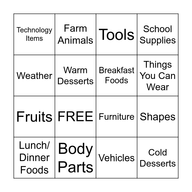 This bingo card has 16 words: Body Parts, Shapes, Tools, Technology Items, Fruits, Farm Animals, Furniture, Vehicles, Weather, Warm Desserts, Lunch/ Dinner Foods, School Supplies, FREE, Things You Can Wear, Breakfast Foods and Cold Desserts.