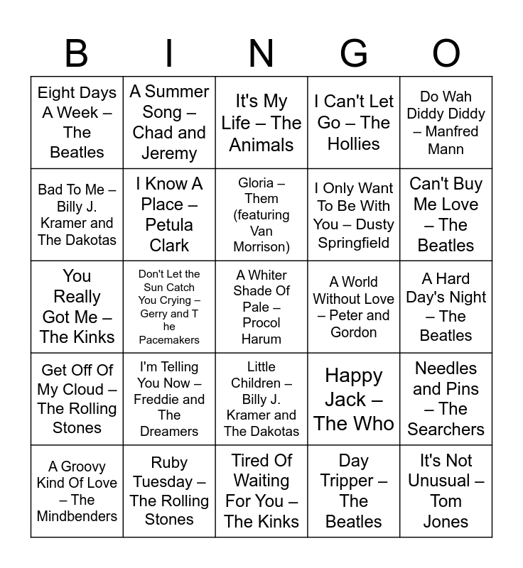 This bingo card has 66 words: I Go To Pieces – Peter and Gordon, Sunshine Of Your Love – Cream, Heart Full Of Soul – The Yardbirds, Needles and Pins – The Searchers, She Loves You – The Beatles, (You've Got To) Hide Your Love Away – Silkie, A Summer Song – Chad and Jeremy, All Day And All Of The Night – The Kinks, Gloria – Them (featuring Van Morrison), Help! - Yosemite Sam w/ Bugs Bunny, Little Children – Billy J. Kramer and The Dakotas, Catch Us If You Can – The Dave Clark Five, A Hard Day's Night – The Beatles, Do Wah Diddy Diddy – Manfred Mann, Downtown – Petula Clark, Bad To Me – Billy J. Kramer and The Dakotas, Don't Let the Sun Catch You Crying – Gerry and The Pacemakers, Eight Days A Week – The Beatles, I Can See For Miles – The Who, I Only Want To Be With You – Dusty Springfield, I'm Telling You Now – Freddie and The Dreamers, Get Off Of My Cloud – The Rolling Stones, I Can't Let Go – The Hollies, Love Potion No. 9 – The Searchers, Mrs. Brown, You've Got A Lovely Daughter – Herman's Hermits, I Like It – Gerry and The Pacemakers, Mellow Yellow – Donovan, You've Got Your Troubles – The Fortunes, A Whiter Shade Of Pale – Procol Harum, (I Can't Get No) Satisfaction – The Rolling Stones, A Groovy Kind Of Love – The Mindbenders, Bus Stop – The Hollies, Ferry Across The Mersey – Gerry and The Pacemakers, Brown-Eyed Girl – Van Morrison, Happy Jack – The Who, Ruby Tuesday – The Rolling Stones, The House Of The Rising Sun – The Animals, You Really Got Me – The Kinks, Day Tripper – The Beatles, Hurdy Gurdy Man – Donovan, I Know A Place – Petula Clark, The Game Of Love – Wayne Fontana and The Mindbenders, A World Without Love – Peter and Gordon, She's Not There – The Zombies, Sunshine Superman – Donovan, What's New, Pussycat? - Alvin and The Chipmunks, Can't Buy Me Love – The Beatles, Glad All Over – The Dave Clark Five, It's Not Unusual – Tom Jones, Shapes Of Things – The Yardbirds, Tell Her No – The Zombies, The Pied Piper – Crispian St. Peters, Stop Stop Stop – The Hollies, Tuesday Afternoon – The Moody Blues, Hippy Hippy Shake – The Swinging Blue Jeans, I Couldn't Live Without Your Love – Petula Clark, Wild Thing – The Troggs, I'm Henry The VIII, I Am – Herman's Hermits, It's My Life – The Animals, Tired Of Waiting For You – The Kinks, Komm, Gib Mir Deine Hand (German single) – The Beatles, Bits and Pieces – The Dave Clark Five, Carrie-Anne – The Hollies, As Tears Go By – The Rolling Stones, My Love – Petula Clark and Ticket To Ride – The Beatles.