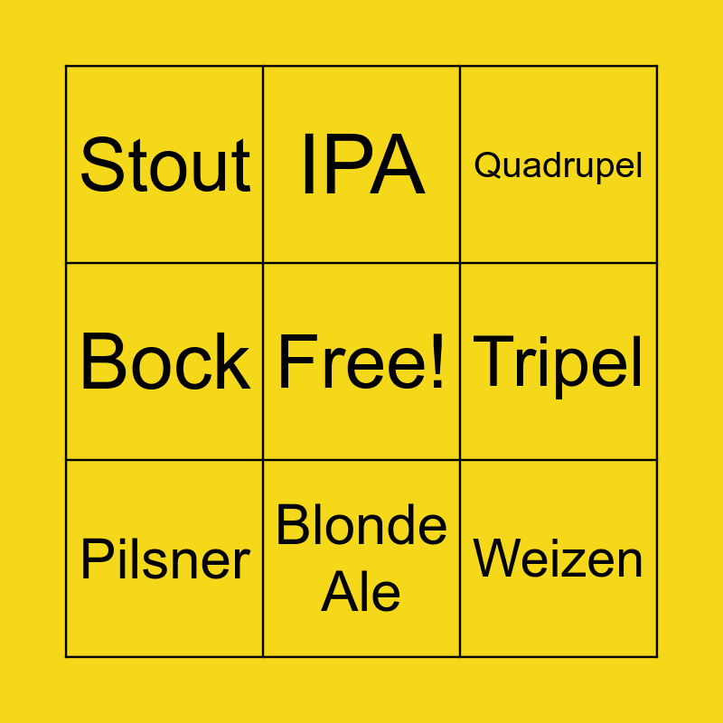 This bingo card has a free space and 8 words: Tripel, Quadrupel, IPA, Pilsner, Stout, Weizen, Bock and Blonde Ale.