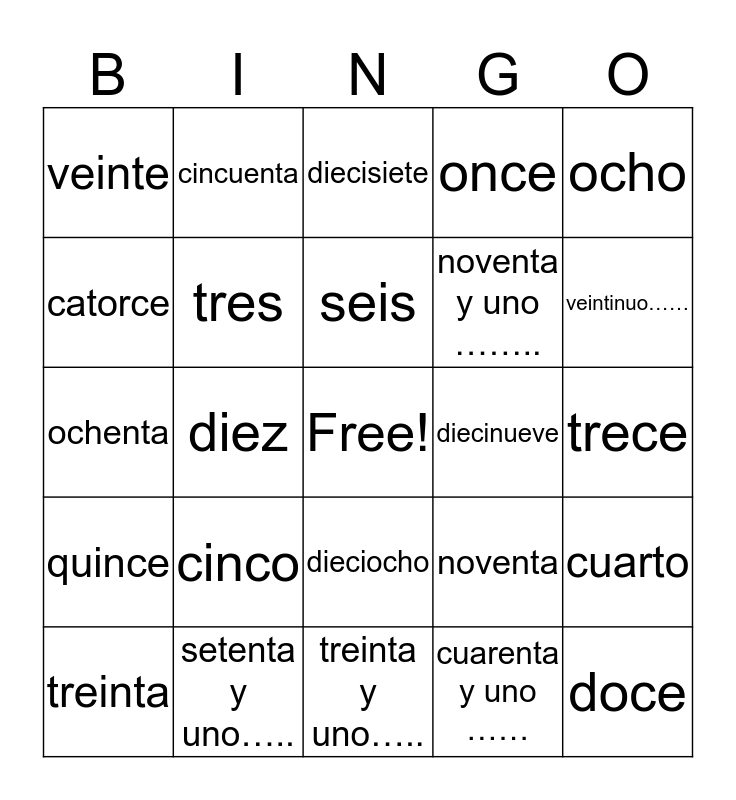 This bingo card has a free space and 37 words: cero, uno, dos, tres, cuarto, cinco, seis, siete, ocho, nueve, diez, once, doce, trece, catorce, quince, dieciseis, diecisiete, dieciocho, diecinueve, veinte, veintinuo……, treinta, treinta y uno….., cuarenta, cuarenta y uno ……, cincuenta, cincuenta y uno……, sesenta, sesenta y uno….., setenta, setenta y uno….., ochenta, ochenta y uno……, noventa, noventa y uno …….. and cien.