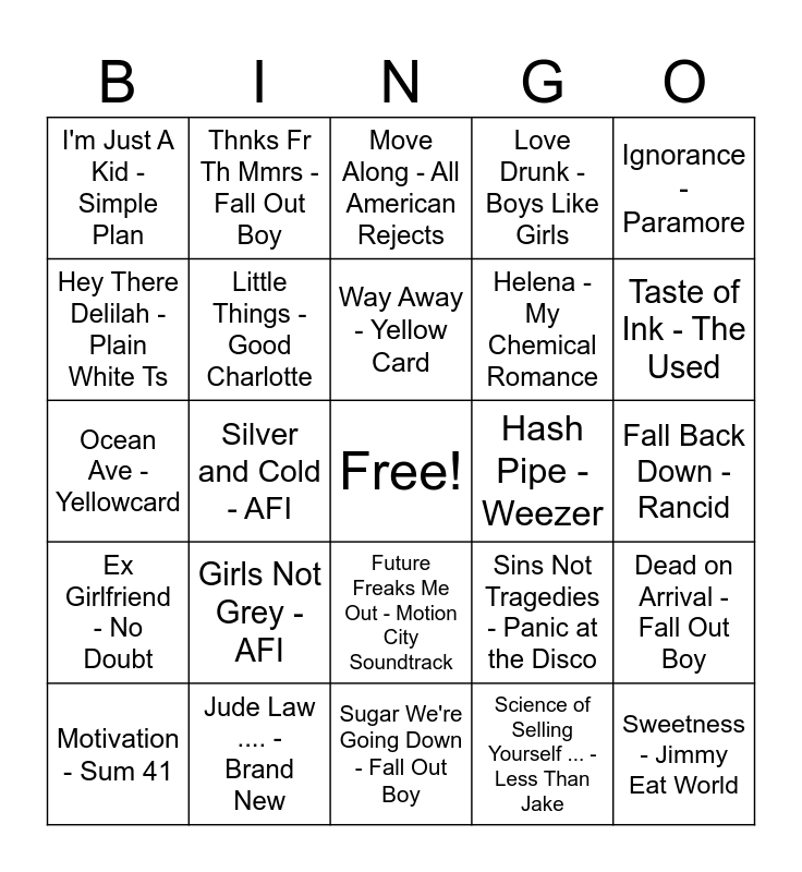 This bingo card has a free space and 37 words: Dirty Little Secret - All American Rejects, Hold My Hand - New Found Glory, Feeling This - Blink 182, Little Things - Good Charlotte, Dead on Arrival - Fall Out Boy, Girls Not Grey - AFI, Way Away - Yellow Card, My Friends Over You - New Found Glory, Ignorance - Paramore, MakeDamnSure - Taking Back Sunday, Silver and Cold - AFI, Love Drunk - Boys Like Girls, Sweetness - Jimmy Eat World, Fall Back Down - Rancid, Hey There Delilah - Plain White Ts, Ex Girlfriend - No Doubt, This Ain't a Scene - Fall Out Boy, Move Along - All American Rejects, Future Freaks Me Out - Motion City Soundtrack, Hash Pipe - Weezer, I'm Just A Kid - Simple Plan, Taste of Ink - The Used, Motivation - Sum 41, Sugar We're Going Down - Fall Out Boy, Fat Lip - Sum 41, Science of Selling Yourself ... - Less Than Jake, Thnks Fr Th Mmrs - Fall Out Boy, Cute Without the E - Taking Back Sunday, That's What You Get - Paramore, Dance Dance - Fall Out Boy, The Rock Show - Blink 182, Jude Law .... - Brand New, Ocean Ave - Yellowcard, Teenagers - My Chemical Romance, Sins Not Tragedies - Panic at the Disco, Helena - My Chemical Romance and Girls & Boys - Good Charlotte.