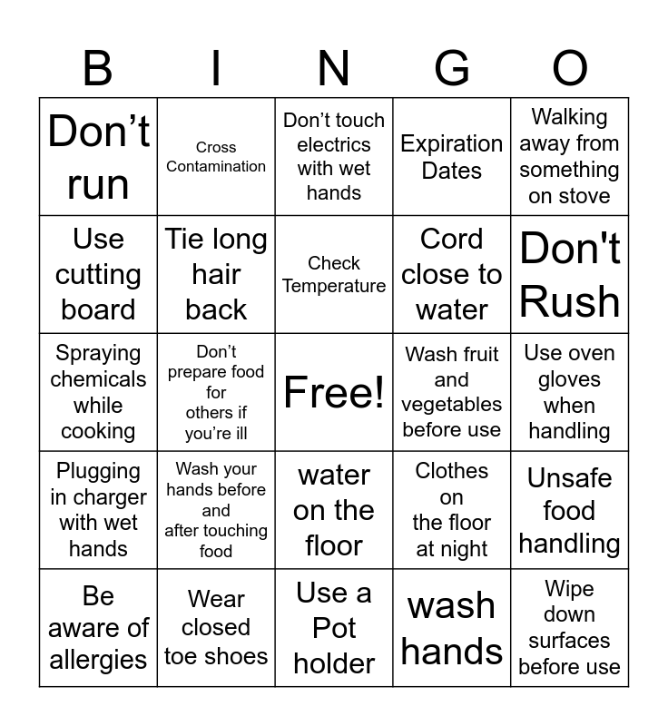This bingo card has a free space and 29 words: Be aware of allergies, Be careful with sharp knives, Don’t prepare food for others if you’re ill, Store and prepare different food types separately, Don’t run, Don’t touch electrics with wet hands, Tie long hair back, Wash your hands before and after touching food, Wash fruit and vegetables before use, Wear closed toe shoes, Use oven gloves when handling, Wipe down surfaces before use, Use a Pot holder, wash hands, Don't Rush, Unlabeled chemicals, water on the floor, Plugging in charger with wet hands, Walking away from something on stove, Spraying chemicals while cooking, Clothes on the floor at night, Unorganized drying rack, Cord close to water, Use cutting board, Expiration Dates, Cross Contamination, Unsafe food handling, Check Temperature and Clean up Spill.