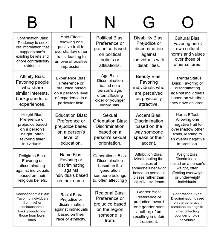 This bingo card has 26 words: Generational Bias: Discrimination based on the generation someone belongs to, often affecting y, Gender Bias: Preference or prejudice toward one gender over another, often resulting in unfair treatment., Age Bias: Discrimination based on a person's age, often affecting older or younger individuals., Racial Bias: Prejudice or discrimination against individuals based on their race or ethnicity., Cultural Bias: Favoring one's own cultural norms and values over those of other cultures., Confirmation Bias: Tendency to seek out information that supports one's existing beliefs and ignore contradictory evidence., Affinity Bias: Favoring people who share similar interests, backgrounds, or experiences., Halo Effect: Allowing one positive trait to overshadow other traits, leading to an overall positive impression., Horns Effect: Allowing one negative trait to overshadow other traits, leading to an overall negative impression., Attribution Bias: Misattributing the causes of someone's behavior based on personal biases rather than objective evidence., Beauty Bias: Favoring individuals who are perceived as physically attractive., Height Bias: Preference or prejudice based on a person's height, often favoring taller individuals., Weight Bias: Discrimination based on a person's weight, often affecting overweight or underweight individuals., Socioeconomic Bias: Favoring individuals from higher socioeconomic backgrounds over those from lower ones., Education Bias: Preference or prejudice based on a person's level of education., Language Bias: Discrimination based on the language someone speaks or their accent., Disability Bias: Prejudice or discrimination against individuals with disabilities., Religious Bias: Favoring or discriminating against individuals based on their religious beliefs., Political Bias: Preference or prejudice based on political beliefs or affiliations., Sexual Orientation Bias: Discrimination based on a person's sexual orientation., Parental Status Bias: Favoring or discriminating against individuals based on whether they have children., Regional Bias: Preference or prejudice based on the region someone is from., Accent Bias: Discrimination based on the way someone speaks or their accent., Name Bias: Favoring or discriminating against individuals based on their name., Experience Bias: Preference or prejudice based on a person's level of experience in a particular field. and Generational Bias: Discrimination based on the generation someone belongs to, often affecting younger or older individuals..