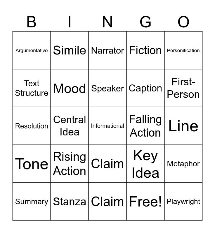 This bingo card has 32 words: Free!, Inference, Central Idea, Author's Purpose, Tone, Mood, Personification, Metaphor, Simile, Playwright, Speaker, Narrator, Setting, Climax, Falling Action, Controlling Idea, Summary, Resolution, Claim, Rising Action, Key Idea, Text Structure, Line, Stanza, Informational, Fiction, Caption, Text Structure, Argumentative, Claim, Third-Person and First-Person.