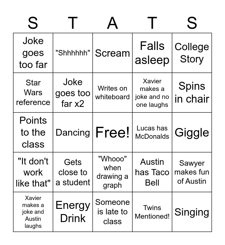 This bingo card has a free space and 24 words: Gets close to a student, Energy Drink, Writes on whiteboard, Xavier makes a joke and Austin laughs, College Story, Joke goes too far, Star Wars reference, "Shhhhhh", Lucas has McDonalds, "Whooo" when drawing a graph, Xavier makes a joke and no one laughs, Points to the class, Austin has Taco Bell, Sawyer makes fun of Austin, Joke goes too far x2, Twins Mentioned!, Giggle, Scream, Spins in chair, Dancing, Singing, "It don't work like that", Falls asleep and Someone is late to class.