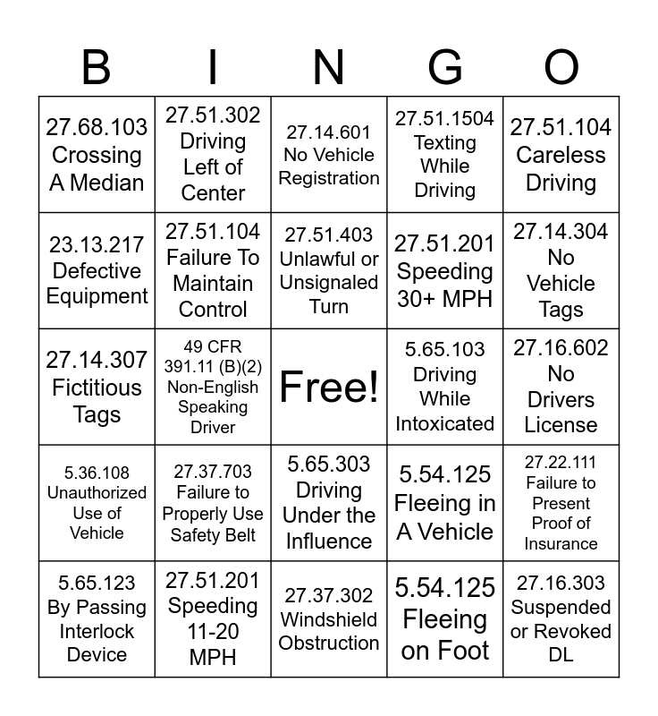 This bingo card has a free space and 24 words: 27.37.703 Failure to Properly Use Safety Belt, 27.51.201 Speeding 11-20 MPH, 27.51.403 Unlawful or Unsignaled Turn, 5.65.123 By Passing Interlock Device, 27.51.104 Careless Driving, 27.68.103 Crossing A Median, 23.13.217 Defective Equipment, 27.51.302 Driving Left of Center, 5.65.103 Driving While Intoxicated, 5.65.303 Driving Under the Influence, 27.51.201 Speeding 30+ MPH, 27.14.307 Fictitious Tags, 5.54.125 Fleeing in A Vehicle, 27.22.111 Failure to Present Proof of Insurance, 27.51.104 Failure To Maintain Control, 5.54.125 Fleeing on Foot, 27.16.602 No Drivers License, 27.14.601 No Vehicle Registration, 27.14.304 No Vehicle Tags, 49 CFR 391.11 (B)(2) Non-English Speaking Driver, 27.16.303 Suspended or Revoked DL, 5.36.108 Unauthorized Use of Vehicle, 27.51.1504 Texting While Driving and 27.37.302 Windshield Obstruction.