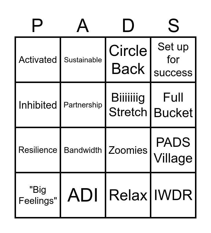 This bingo card has 25 words: Dog Distraction, Enrichment, Full Bucket, Trigger Stacked, Inhibited, Activated, Partnership, Sustainable, ADI, Decompress, Resilience, Zoomies, Cue, Connection, Biiiiiiig Stretch, House Manners, Relax, Circle Back, Bandwidth, PADS Village, "Big Feelings", Salesforce, IWDR, Set up for success and "The Board".