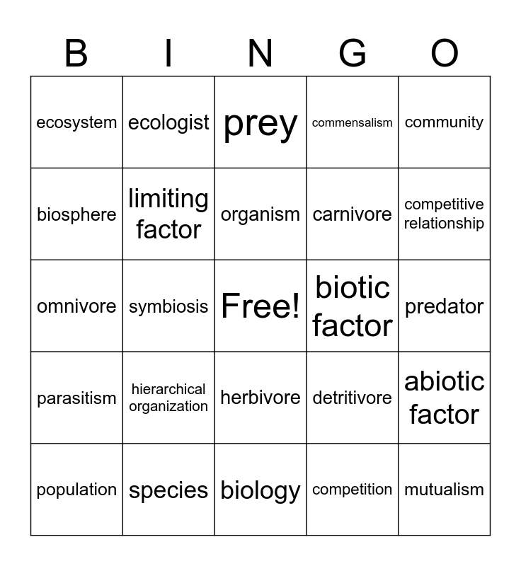 This bingo card has a free space and 24 words: hierarchical organization, species, organism, population, community, ecosystem, biosphere, ecologist, biotic factor, herbivore, carnivore, omnivore, detritivore, abiotic factor, limiting factor, competition, predator, prey, competitive relationship, symbiosis, mutualism, parasitism, commensalism and biology.
