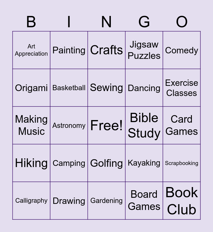 This bingo card has a free space and 29 words: Calligraphy, Baking, Astronomy, Birdwatching, Art Appreciation, Crafts, Basketball, Camping, Bible Study, Drawing, Card Games, Book Club, Gardening, Board Games, Exercise Classes, Collecting, Golfing, Hiking, Comedy, Making Music, Kayaking, Cooking, Dancing, Origami, Jigsaw Puzzles, Painting, Scrapbooking, Sewing and Skiing or Snowboarding.