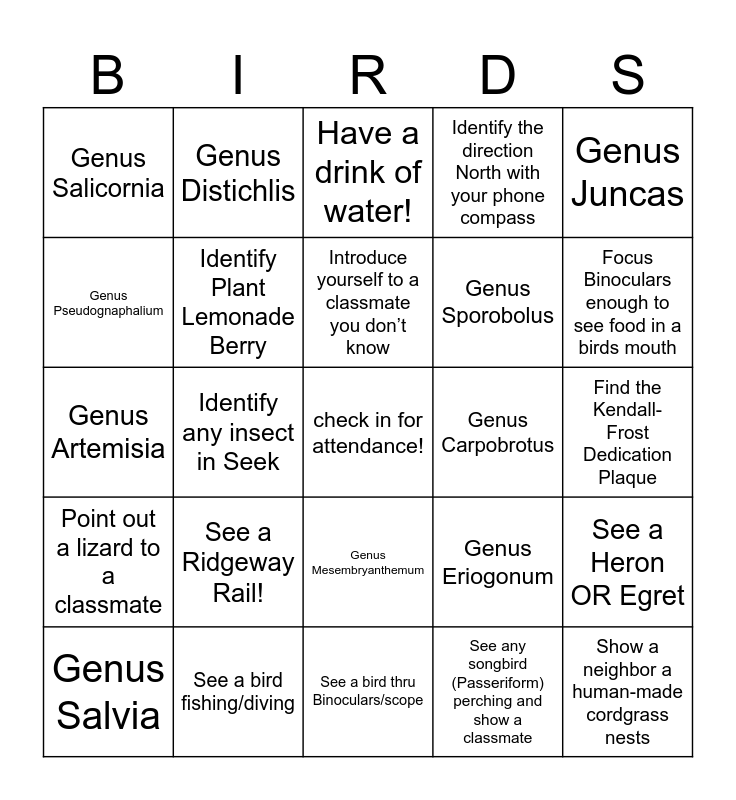 This bingo card has a free space and 25 words: See a Ridgeway Rail!, See a bird thru Binoculars/scope, Introduce yourself to a classmate you don’t know, Genus Salvia, Genus Juncas, Genus Salicornia, Genus Pseudognaphalium, Genus Distichlis, Genus Carpobrotus, Genus Mesembryanthemum, Genus Sporobolus, Genus Artemisia, Genus Eriogonum, See a Heron OR Egret, Identify Plant Lemonade Berry, See a Hummingbird flying, Find the Kendall-Frost Dedication Plaque, Have a drink of water!, Focus Binoculars enough to see food in a birds mouth, Identify any insect in Seek, Show a neighbor a human-made cordgrass nests, See a bird fishing/diving, Point out a lizard to a classmate, Identify the direction North with your phone compass and See any songbird (Passeriform) perching and show a classmate.