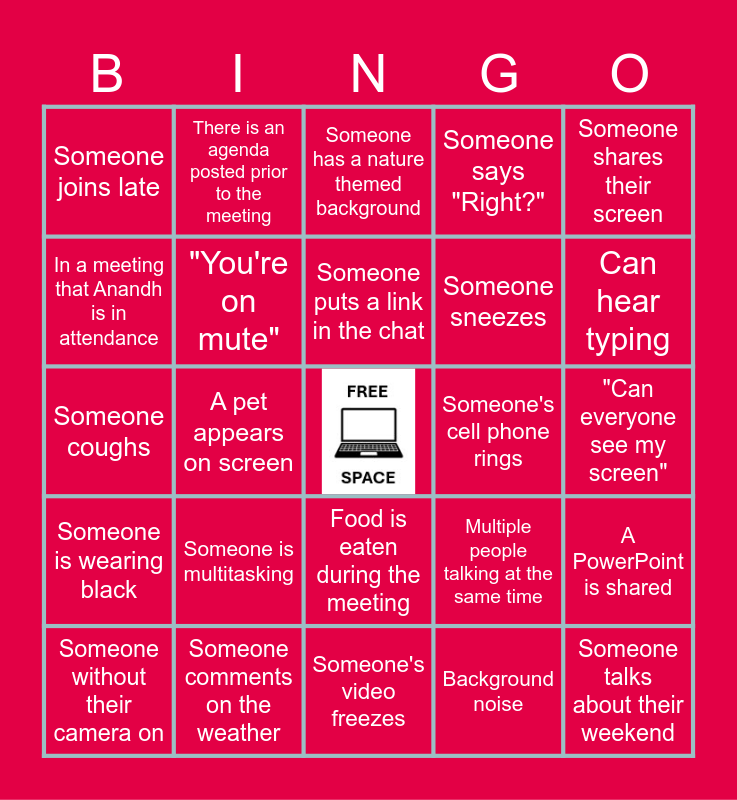 This bingo card has a free space and 29 words: Someone without their camera on, "I have to jump on another call", A pet appears on screen, Awkward silence, Someone joins late, Someone has a nature themed background, "You're on mute", Someone is multitasking, Someone's cell phone rings, Someone comments on the weather, "Can everyone see my screen", Someone talks about their weekend, Someone's video freezes, Background noise, Can hear typing, Off-topic conversation, Food is eaten during the meeting, Someone is wearing black, Someone shares their screen, Someone coughs, Multiple people talking at the same time, Silence after a question is asked, Someone sneezes, In a meeting that Anandh is in attendance, Someone says "Right?", There is an agenda posted prior to the meeting, A PowerPoint is shared, Someone puts a link in the chat and Meeting is being recorded.