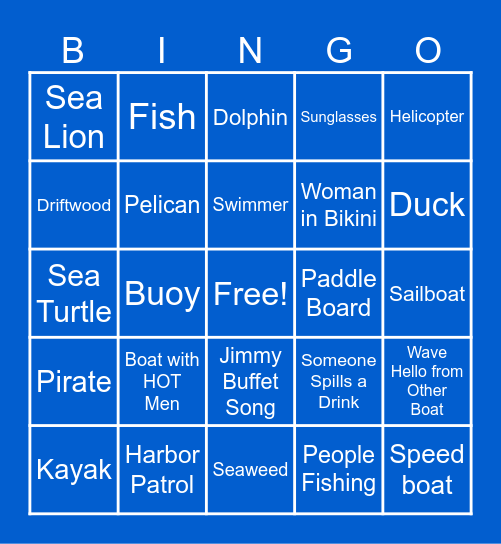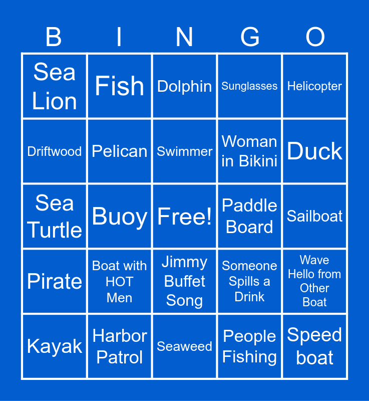 This bingo card has a free space and 29 words: Kayak, Dog on Boat, Buoy, Anchor, Sea Lion, Dolphin, Pelican, Boat with HOT Men, Paddle Board, Harbor Patrol, Sailboat, Speed boat, Seaweed, People Fishing, Duck, Jet Ski, Jimmy Buffet Song, Pirate, Helicopter, Sea Turtle, Someone Spills a Drink, Shirtless Dude, Woman in Bikini, Driftwood, Sunglasses, Fish, Wave Hello from Other Boat, Swimmer and USA Flag.