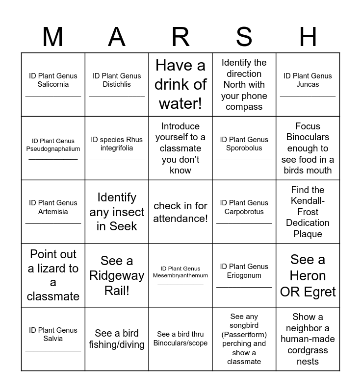 This bingo card has a free space and 25 words: See a Ridgeway Rail!, See a bird thru Binoculars/scope, Introduce yourself to a classmate you don’t know, ID Plant Genus Salvia ______________, ID Plant Genus Juncas ______________, ID Plant Genus Salicornia ______________, ID Plant Genus Pseudognaphalium ______________, ID Plant Genus Distichlis ______________, ID Plant Genus Carpobrotus ______________, ID Plant Genus Mesembryanthemum ______________, ID Plant Genus Sporobolus ______________, ID Plant Genus Artemisia ______________, ID Plant Genus Eriogonum ______________, See a Heron OR Egret, ID species Rhus integrifolia ______________, See a Hummingbird flying, Find the Kendall-Frost Dedication Plaque, Have a drink of water!, Focus Binoculars enough to see food in a birds mouth, Identify any insect in Seek, Show a neighbor a human-made cordgrass nests, See a bird fishing/diving, Point out a lizard to a classmate, Identify the direction North with your phone compass and See any songbird (Passeriform) perching and show a classmate.