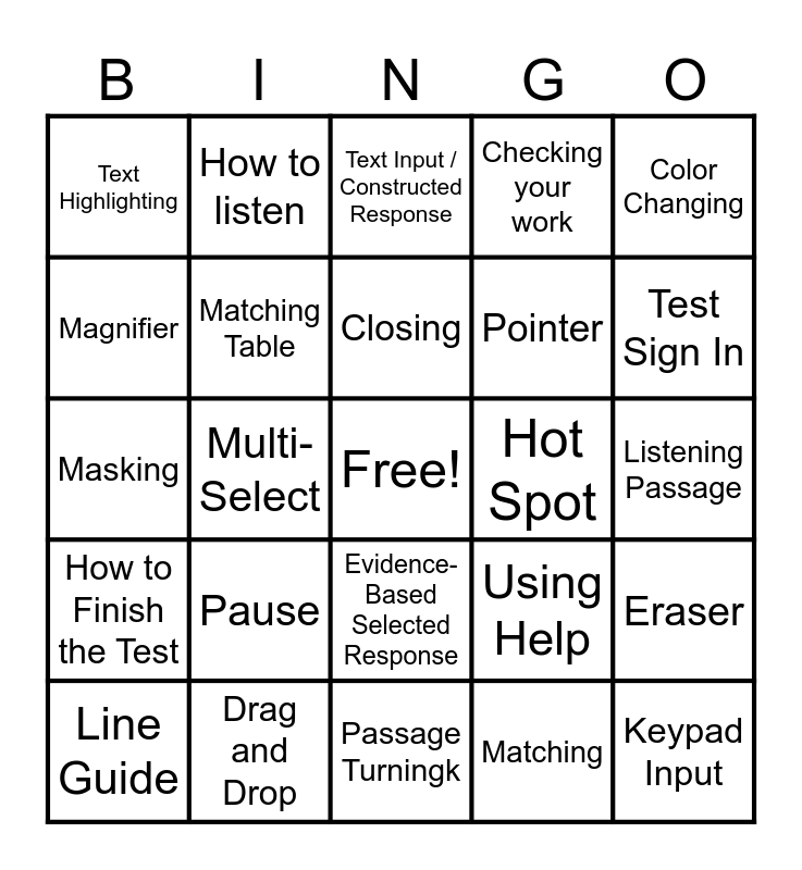 This bingo card has a free space and 30 words: Drag and Drop, Drop Down, Multi-Select, Select to Respond / Enlarge, Text Highlighting, Text Input / Constructed Response, Matching Table, Evidence- Based Selected Response, Hot Spot, Passage Turningk, Listening Passage, Keypad Input, Matching, Interface Tool Tips, Test Sign In, Testing Basics, Using Help, How to Finish the Test, Pause, Color Changing, Masking, Notepad, How to listen, Pointer, Magnifier, Checking your work, Eraser, Line Guide, Closing and Taking Notes.