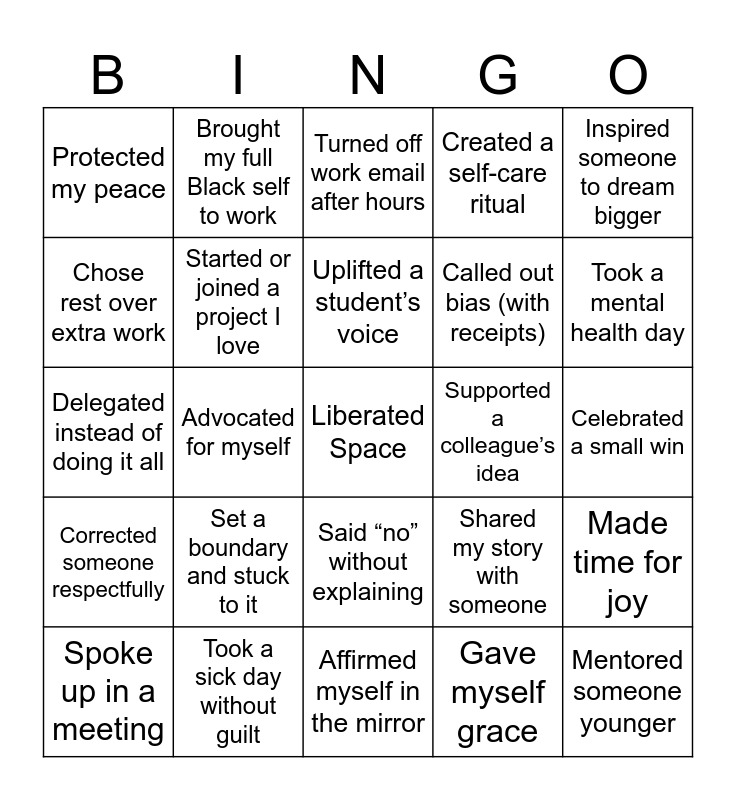 This bingo card has a free space and 24 words: Set a boundary and stuck to it, Took a sick day without guilt, Uplifted a student’s voice, Spoke up in a meeting, Inspired someone to dream bigger, Protected my peace, Chose rest over extra work, Brought my full Black self to work, Supported a colleague’s idea, Said “no” without explaining, Called out bias (with receipts), Delegated instead of doing it all, Shared my story with someone, Made time for joy, Started or joined a project I love, Gave myself grace, Celebrated a small win, Turned off work email after hours, Took a mental health day, Advocated for myself, Mentored someone younger, Corrected someone respectfully, Created a self-care ritual and Affirmed myself in the mirror.