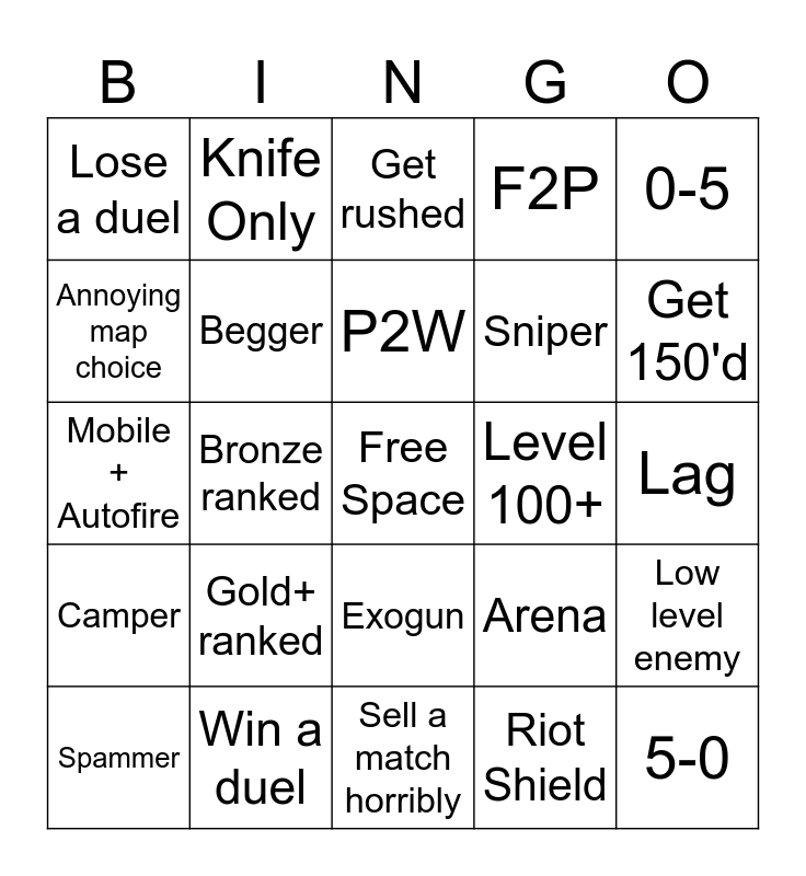 This bingo card has a free space and 38 words: Tons of skins, AFK, Freeze Ray, Begger, Low level enemy, Gold+ ranked, P2W, Actually balanced fight, 0-5, Sniper, Bronze ranked, F2P, 5-0, Lag, Annoying map choice, Camper, Runner, Get rushed, Enemy disconnected, Level 100+, Lose a duel, Win a duel, Get 150'd, Spammer, Enemy is actually skilled, Sell a match horribly, VC (Bonus points if child), Both low health, Environment death, Katana, Slingshot, Exogun, Riot Shield, Knife Only, Backrooms + RPG, Arena, Mobile + Autofire and Controller + Autoaim.