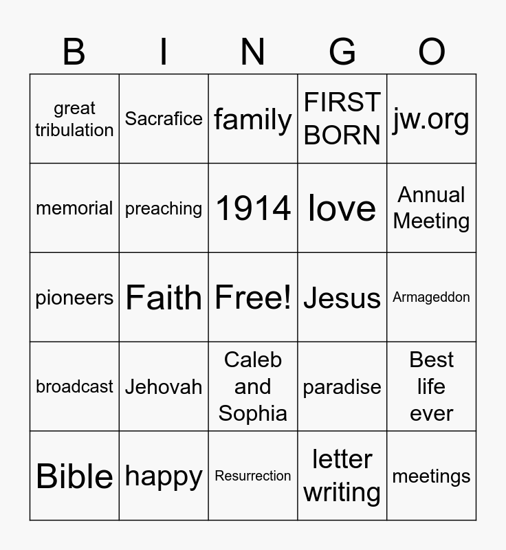 This bingo card has a free space and 29 words: Bible, God, Faith, Hope, great tribulation, family, preaching, Jehovah, Jesus, happy, Armageddon, meetings, Resurrection, letter writing, Annual Meeting, ministry, Caleb and Sophia, broadcast, jw.org, pioneers, paradise, phone witnessing, love, memorial, FIRST BORN, Sacrafice, Best life ever, 1914 and Sheep.