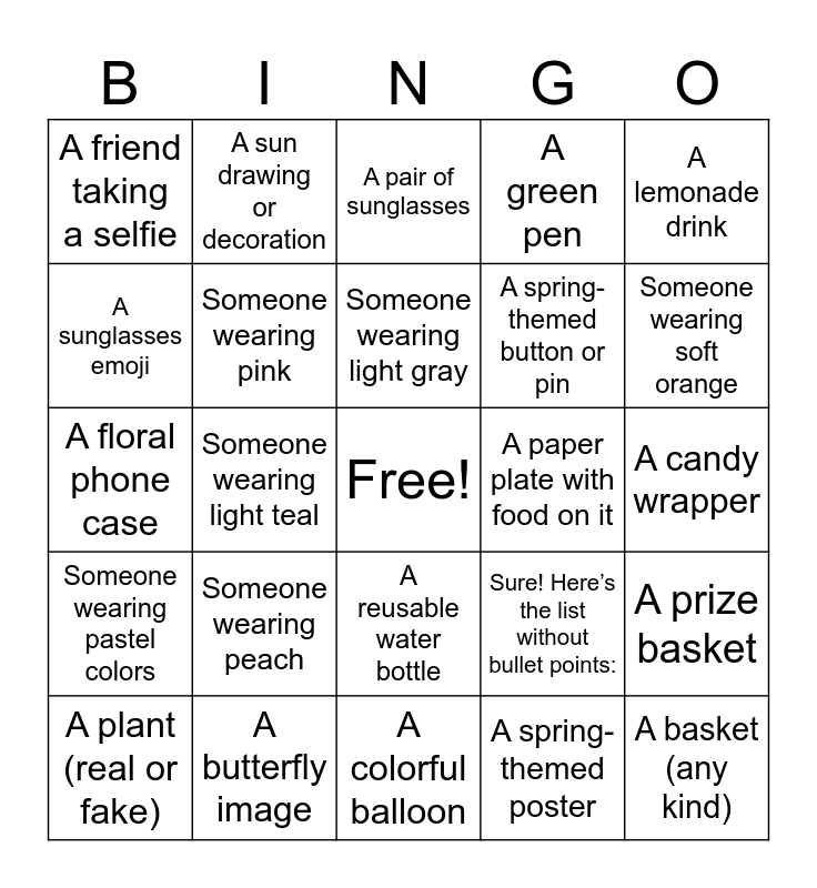 This bingo card has a free space and 54 words: A flower sticker, Someone wearing pastel colors, A spring-themed decoration, A bunny image or toy, A reusable water bottle, A flyer with the word “spring”, A green pen, A snack with fruit flavor, A sunglasses emoji, A floral-scented item, A friend taking a selfie, Someone dancing, A butterfly image, A plant (real or fake), A person wearing a name tag, A colorful balloon, A basket (any kind), A spring-themed button or pin, A handwritten note, A candy wrapper, Sure! Here’s the list without bullet points:, A person wearing a flower crown, A paper plate with food on it, A lemonade drink, Someone blowing bubbles, A sun drawing or decoration, A pastel tablecloth, A bracelet or beaded jewelry, A person giving a thumbs up, A spring-themed poster, A tote bag with a design, A cupcake or dessert, A foam cutout or prop, A student organization table, A pair of sunglasses, A spring-colored pen or marker, A floral phone case, A prize basket, Someone making a craft, Someone wearing pink, Someone wearing pastel yellow, Someone wearing baby blue, Someone wearing lavender, Someone wearing mint green, Someone wearing peach, Someone wearing white, Someone wearing sky blue, Someone wearing coral, Someone wearing light gray, Someone wearing light teal, Someone wearing soft orange, Someone wearing floral print, Someone wearing a colorful accessory and Someone wearing multiple spring colors.