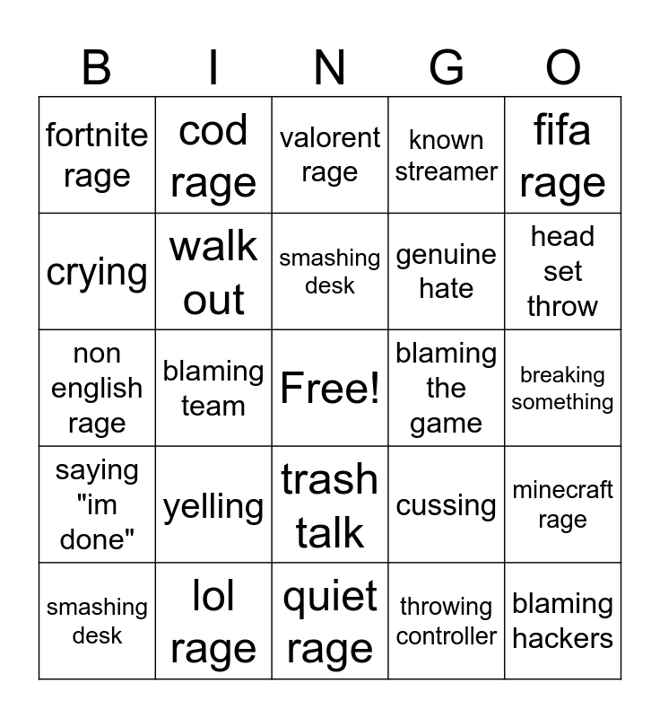 This bingo card has a free space and 24 words: smashing desk, yelling, smashing desk, throwing controller, fifa rage, fortnite rage, cod rage, valorent rage, blaming the game, breaking something, non english rage, walk out, cussing, minecraft rage, crying, lol rage, quiet rage, known streamer, head set throw, saying "im done", blaming team, trash talk, genuine hate and blaming hackers.