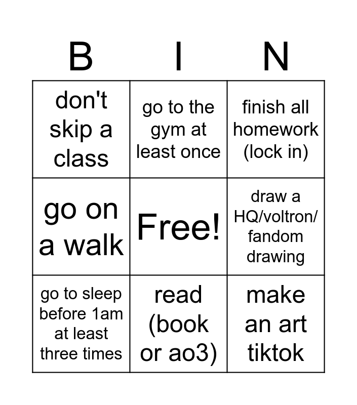 This bingo card has a free space and 8 words: draw a HQ/voltron/ fandom drawing, finish all homework (lock in), go to the gym at least once, go to sleep before 1am at least three times, don't skip a class, make an art tiktok, go on a walk and read (book or ao3).