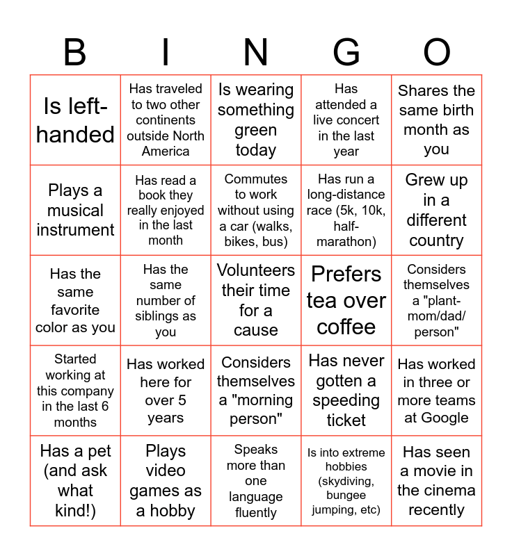 This bingo card has 25 words: Has worked here for over 5 years, Speaks more than one language fluently, Commutes to work without using a car (walks, bikes, bus), Has a pet (and ask what kind!), Shares the same birth month as you, Is left-handed, Plays a musical instrument, Has traveled to two other continents outside North America, Prefers tea over coffee, Considers themselves a "morning person", Has run a long-distance race (5k, 10k, half-marathon), Has the same favorite color as you, Has never gotten a speeding ticket, Has worked in three or more teams at Google, Has read a book they really enjoyed in the last month, Has seen a movie in the cinema recently, Considers themselves a "plant-mom/dad/ person", Is wearing something green today, Grew up in a different country, Has the same number of siblings as you, Volunteers their time for a cause, Plays video games as a hobby, Started working at this company in the last 6 months, Has attended a live concert in the last year and Is into extreme hobbies (skydiving, bungee jumping, etc).