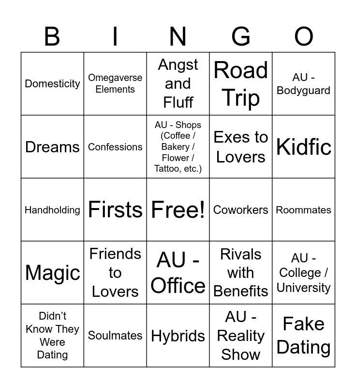This bingo card has a free space and 83 words: 3+1 / 5+1 Times, Angst, Angst and Fluff, Animals / Pets, Arranged Marriage, Based on Other Media, Blind Date, Celestial Beings, Chan POV, Childhood Friends, Childhood Sweethearts, Commitment Issues, Confessions, Coworkers, Dares, Domesticity, Didn’t Know They Were Dating, Dreams, Enemies / Rivals to Lovers, Established Relationship, Exes, Exes to Lovers, Fake Dating, Feelings Realization, Firsts, Fluff, Food / Cooking, Forbidden Love, Found Family, Friends With Benefits, Friends to Lovers, Gender Changes, Ghosts / Paranormal, Handholding, Happy Ending, Hurt / Comfort, Hybrids, Idiots in Love, Kidfic, Magic, Marriage / Married Life / Weddings, Marriage of Convenience, Minho POV, Mistaken Identity, Mutual Pining, Neighbors, Omegaverse Elements, One Night Stands, Partners in Crime, Pining, Rivals with Benefits, Road Trip, Roommates, Secret Admirer, Sharing a Bed, Sickfic, Slice of Life, Slow Burn, Soulmates, Strangers to Lovers, Supernatural Elements, Time (Travel, Loops, etc.), Trapped Together, AU - Bodyguard, AU - Canon Divergent, AU - College / University, AU - Different First Meeting, AU - Fantasy, AU - Inspired by SKZ MV, AU - Modern, AU - Modern with Magic, AU - Multiverse, AU - Non-Idol Celebrity, AU - Office, AU - Reality Show, AU - Rock Band, AU - Royalty, AU - Shops (Coffee / Bakery / Flower / Tattoo, etc.), AU - Small Town, AU - Spies / Secret Agents, AU - Teachers, AU - Vampires and AU - Werewolves.