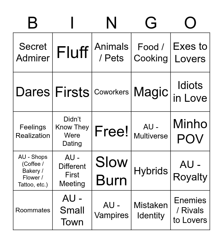 This bingo card has a free space and 75 words: 3+1 / 5+1 Times, Angst and Fluff, Animals / Pets, Arranged Marriage, Based on Other Media, Blind Date, Celestial Beings, Chan POV, Childhood Friends, Childhood Sweethearts, Commitment Issues, Confessions, Coworkers, Dares, Domesticity, Didn’t Know They Were Dating, Dreams, Enemies / Rivals to Lovers, Established Relationship, Exes to Lovers, Fake Dating, Feelings Realization, Firsts, Fluff, Food / Cooking, Forbidden Love, Found Family, Friends With Benefits, Friends to Lovers, Ghosts / Paranormal, Handholding, Happy Ending, Hurt / Comfort, Hybrids, Idiots in Love, Magic, Marriage / Married Life / Weddings, Marriage of Convenience, Minho POV, Mistaken Identity, Mutual Pining, Neighbors, Omegaverse Elements, One Night Stands, Pining, Rivals with Benefits, Roommates, Secret Admirer, Sharing a Bed, Sickfic, Slice of Life, Slow Burn, Soulmates, Strangers to Lovers, Supernatural Elements, Time (Travel, Loops, etc.), Trapped Together, AU - Bodyguard, AU - Canon Divergent, AU - College / University, AU - Different First Meeting, AU - Fantasy, AU - Inspired by SKZ MV, AU - Modern, AU - Modern with Magic, AU - Multiverse, AU - Non-Idol Celebrity, AU - Office, AU - Rock Band, AU - Royalty, AU - Shops (Coffee / Bakery / Flower / Tattoo, etc.), AU - Small Town, AU - Spies / Secret Agents, AU - Vampires and AU - Werewolves.