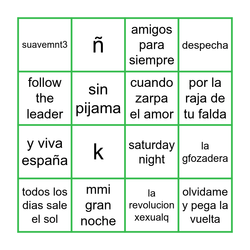 This bingo card has 40 words: Rio Verde, saturday night, ritmo de la noche, cuando zarpa el amor, yo quiero bvailar, sarandonga por l, por la raja de tu falda, gasolina, follow the leader, olvidame y pega la vuelta, la gfozadera, despecha, todos los dias sale el sol, la revolucion xexualq, mmi gran noche, the final countdown, para no verte mas sua, suavemnt3, mamo, amigos para siempre, todo de ti, mentirosa, y viva españa, sin pijama, a, b, c, d, e, f, g, h, y, j, k, l, m, n, ñ and o.
