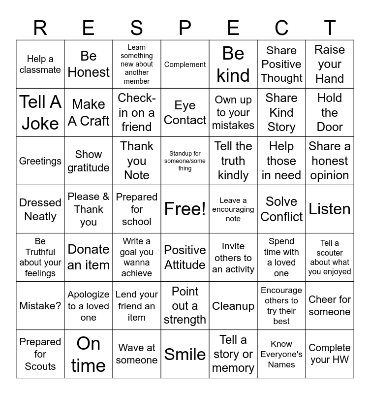 This bingo card has a free space and 48 words: Cleanup, Share Kind Story, Smile, Please & Thank you, Thank you Note, Listen, Be Honest, On time, Share Positive Thought, Positive Attitude, Raise your Hand, Complement, Help those in need, Tell the truth kindly, Mistake?, Solve Conflict, Tell A Joke, Hold the Door, Encourage others to try their best, Be kind, Own up to your mistakes, Prepared for school, Help a classmate, Make A Craft, Cheer for someone, Check-in on a friend, Share a honest opinion, Prepared for Scouts, Standup for someone/some thing, Show gratitude, Know Everyone's Names, Leave a encouraging note, Tell a scouter about what you enjoyed, Apologize to a loved one, Dressed Neatly, Invite others to an activity, Spend time with a loved one, Greetings, Write a goal you wanna achieve, Lend your friend an item, Be Truthful about your feelings, Complete your HW, Learn something new about another member, Wave at someone, Eye Contact, Point out a strength, Donate an item and Tell a story or memory.