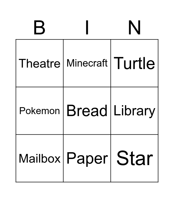This bingo card has 9 words: Mailbox, Turtle, Minecraft, Pokemon, Theatre, Library, Bread, Star and Paper.