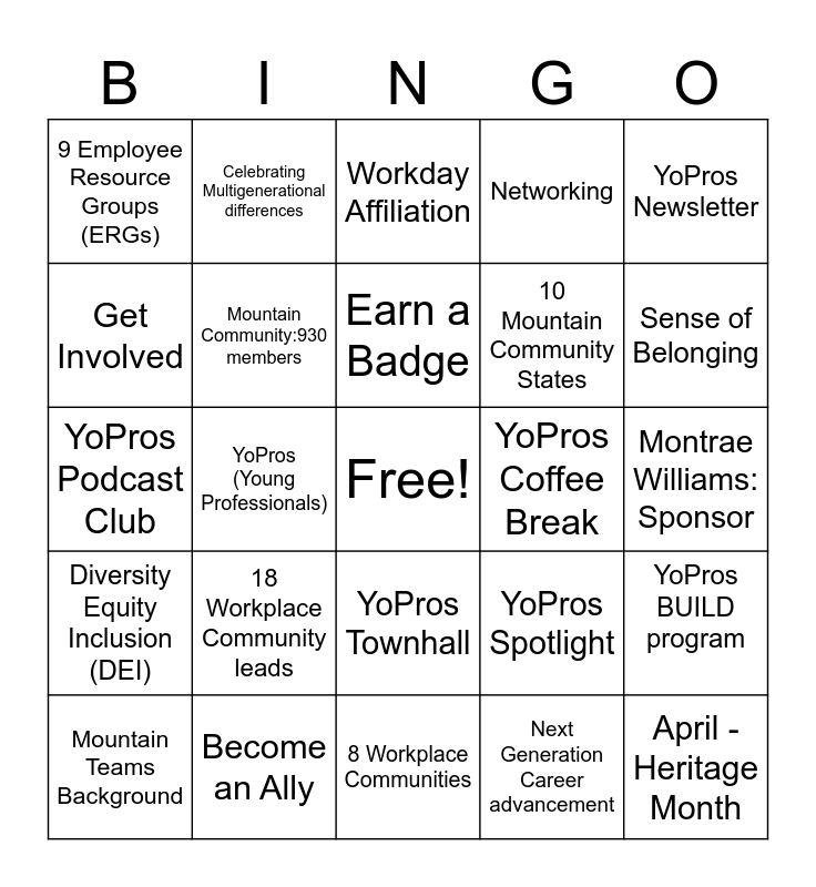 This bingo card has a free space and 24 words: 18 Workplace Community leads, Become an Ally, Earn a Badge, Mountain Teams Background, YoPros Newsletter, 9 Employee Resource Groups (ERGs), Get Involved, Celebrating Multigenerational differences, YoPros Coffee Break, YoPros Townhall, 10 Mountain Community States, YoPros Podcast Club, YoPros Spotlight, YoPros BUILD program, Mountain Community:930 members, Next Generation Career advancement, Montrae Williams: Sponsor, Workday Affiliation, Sense of Belonging, YoPros (Young Professionals), April - Heritage Month, Diversity Equity Inclusion (DEI), Networking and 8 Workplace Communities.
