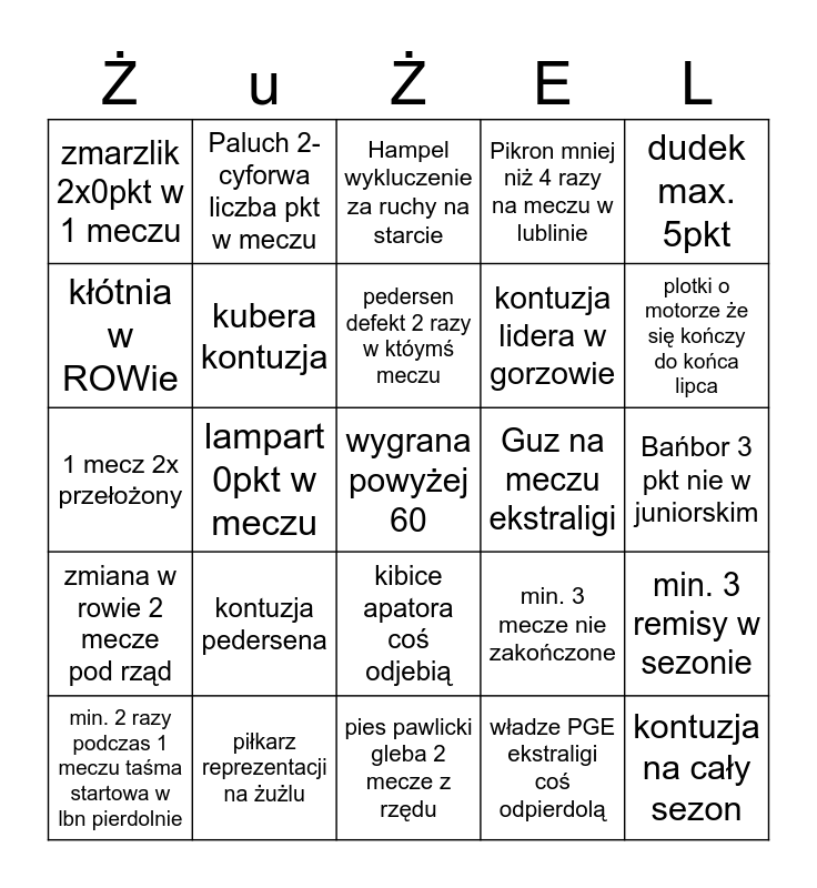 This bingo card has 25 words: kontuzja pedersena, pies pawlicki gleba 2 mecze z rzędu, pedersen defekt 2 razy w któymś meczu, min. 2 razy podczas 1 meczu taśma startowa w lbn pierdolnie, dudek max. 5pkt, zmarzlik 2x0pkt w 1 meczu, kłótnia w ROWie, Paluch 2-cyforwa liczba pkt w meczu, Guz na meczu ekstraligi, kibice apatora coś odjebią, kontuzja lidera w gorzowie, 1 mecz 2x przełożony, min. 3 mecze nie zakończone, min. 3 remisy w sezonie, kubera kontuzja, kontuzja na cały sezon, Bańbor 3 pkt nie w juniorskim, Hampel wykluczenie za ruchy na starcie, plotki o motorze że się kończy do końca lipca, lampart 0pkt w meczu, wygrana powyżej 60, piłkarz reprezentacji na żużlu, zmiana w rowie 2 mecze pod rząd, Pikron mniej niż 4 razy na meczu w lublinie and władze PGE ekstraligi coś odpierdolą.