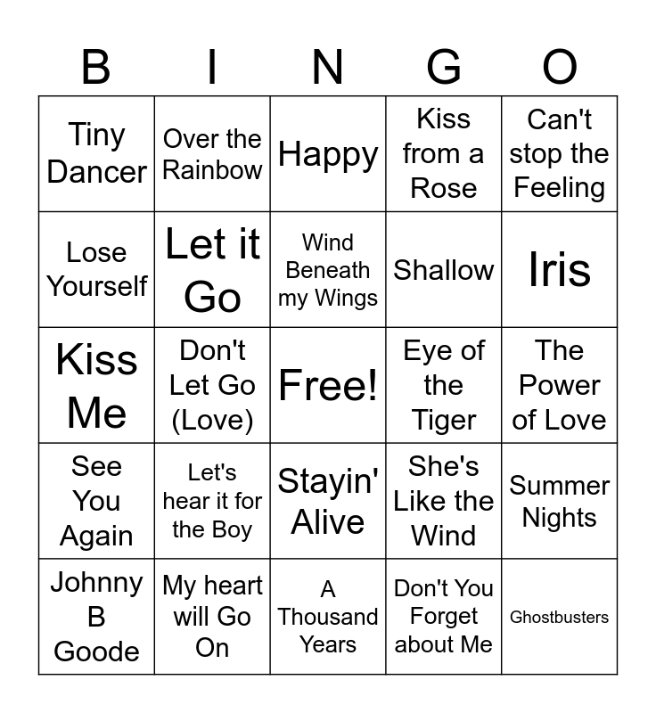 This bingo card has a free space and 37 words: Purple Rain, I will always love you, I've had the time of my life, Let it Go, Summer Nights, Let's hear it for the Boy, Wind Beneath my Wings, I believe I can Fly, Can't stop the Feeling, 9 to 5, Don't Let Go (Love), Kiss from a Rose, Ghostbusters, The Power of Love, Lose Yourself, See You Again, Gangsta's Paradise, Happy, Stayin' Alive, Eye of the Tiger, Tiny Dancer, Iris, Johnny B Goode, A Thousand Years, Flashdance...What a feeling, Don't You Forget about Me, Over the Rainbow, Footloose, Jailhouse Rock, Can you Feel the Love Tonight, Old Time Rock & Roll, My heart will Go On, Kiss Me, Unchained Melody, She's Like the Wind, Shallow and Take my Breath Away.