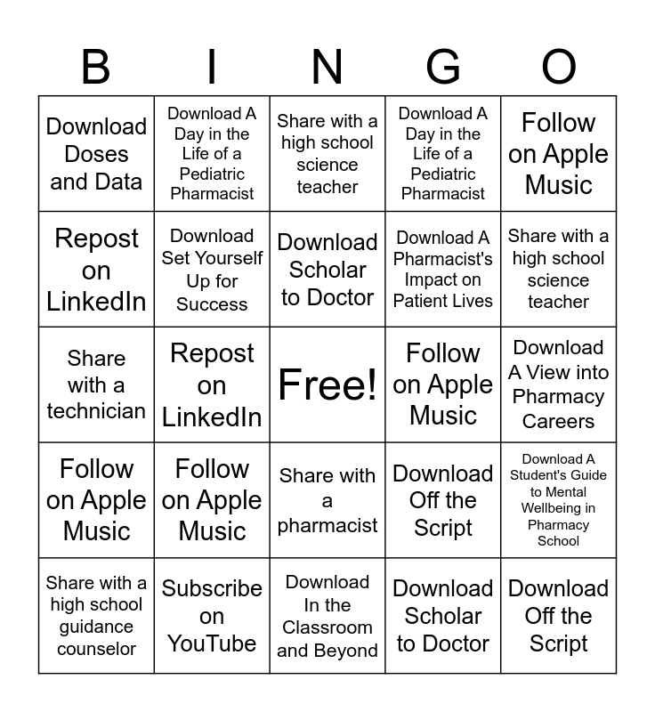 This bingo card has a free space and 112 words: Download In the Classroom and Beyond, Download A View into Pharmacy Careers, Download Off the Script, Download Elevating the Profession and Patient Care, Download Scholar to Doctor, Download Set Yourself Up for Success, Download A Day in the Life of a Pediatric Pharmacist, Download Pharmacist Shortage, Download Behind the Counter, Download A Student's Guide to Mental Wellbeing in Pharmacy School, Download A Pharmacist's Impact on Patient Lives, Download Doses and Data, Repost on LinkedIn, Like an episode on YouTube, Share with a friend, Share with a family member, Share with a pharmacist, Share with a technician, Share with your boss, Share with a high schooler, Share with a high school guidance counselor, Share with a high school science teacher, Share with a guest speaker and ask them to share it, Share one episode on social media, Follow on Spotify, Follow on Apple Music, Subscribe on YouTube, Find Pharmacy Frontier’s Podcast on one platform, Download A Student's Guide to Mental Wellbeing in Pharmacy School, Download A Pharmacist's Impact on Patient Lives, Download Doses and Data, Repost on LinkedIn, Like an episode on YouTube, Share with a friend, Share with a family member, Share with a pharmacist, Share with a technician, Share with your boss, Share with a high schooler, Share with a high school guidance counselor, Share with a high school science teacher, Share with a guest speaker and ask them to share it, Share one episode on social media, Follow on Spotify, Follow on Apple Music, Subscribe on YouTube, Find Pharmacy Frontier’s Podcast on one platform, Download In the Classroom and Beyond, Download A View into Pharmacy Careers, Download Off the Script, Download Elevating the Profession and Patient Care, Download Scholar to Doctor, Download Set Yourself Up for Success, Download A Day in the Life of a Pediatric Pharmacist, Download Pharmacist Shortage, Download Behind the Counter, Download A Day in the Life of a Pediatric Pharmacist, Download Pharmacist Shortage, Download Behind the Counter, Download A Student's Guide to Mental Wellbeing in Pharmacy School, Download A Pharmacist's Impact on Patient Lives, Download Doses and Data, Repost on LinkedIn, Like an episode on YouTube, Share with a friend, Share with a family member, Share with a pharmacist, Share with a technician, Share with your boss, Share with a high schooler, Share with a high school guidance counselor, Share with a high school science teacher, Share with a guest speaker and ask them to share it, Share one episode on social media, Follow on Spotify, Follow on Apple Music, Subscribe on YouTube, Find Pharmacy Frontier’s Podcast on one platform, Download In the Classroom and Beyond, Download A View into Pharmacy Careers, Download Off the Script, Download Elevating the Profession and Patient Care, Download Scholar to Doctor, Download Set Yourself Up for Success, Share with your boss, Share with a high schooler, Share with a high school guidance counselor, Share with a high school science teacher, Share with a guest speaker and ask them to share it, Share one episode on social media, Follow on Spotify, Follow on Apple Music, Subscribe on YouTube, Find Pharmacy Frontier’s Podcast on one platform, Download In the Classroom and Beyond, Download A View into Pharmacy Careers, Download Off the Script, Download Elevating the Profession and Patient Care, Download Scholar to Doctor, Download Set Yourself Up for Success, Download A Day in the Life of a Pediatric Pharmacist, Download Pharmacist Shortage, Download Behind the Counter, Download A Student's Guide to Mental Wellbeing in Pharmacy School, Download A Pharmacist's Impact on Patient Lives, Download Doses and Data, Repost on LinkedIn, Like an episode on YouTube, Share with a friend, Share with a family member, Share with a pharmacist and Share with a technician.