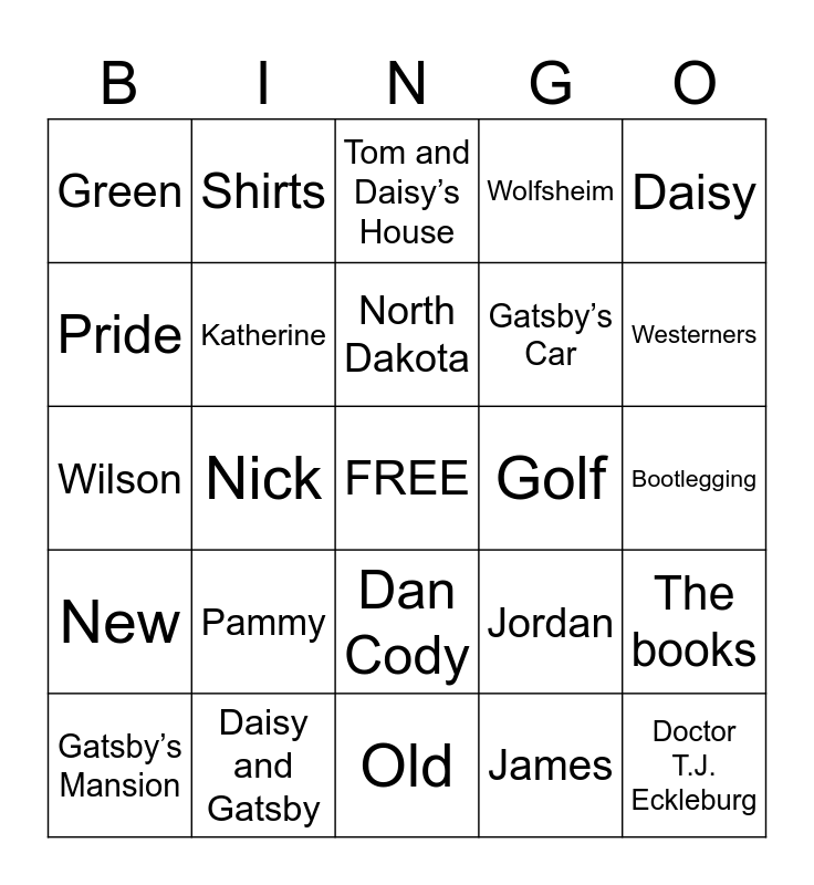 This bingo card has a free space and 24 words: Gatsby’s Mansion, Pammy, North Dakota, James, Daisy, Green, Shirts, Tom and Daisy’s House, Golf, Bootlegging, Wilson, Katherine, Jordan, The books, Pride, Daisy and Gatsby, Old, Wolfsheim, Westerners, New, Nick, Dan Cody, Gatsby’s Car and Doctor T.J. Eckleburg.