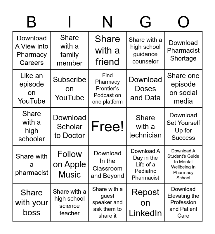 This bingo card has a free space and 28 words: Download A Student's Guide to Mental Wellbeing in Pharmacy School, Download A Pharmacist's Impact on Patient Lives, Download Doses and Data, Repost on LinkedIn, Like an episode on YouTube, Share with a friend, Share with a family member, Share with a pharmacist, Share with a technician, Share with your boss, Share with a high schooler, Share with a high school guidance counselor, Share with a high school science teacher, Share with a guest speaker and ask them to share it, Share one episode on social media, Follow on Spotify, Follow on Apple Music, Subscribe on YouTube, Find Pharmacy Frontierβs Podcast on one platform, Download In the Classroom and Beyond, Download A View into Pharmacy Careers, Download Off the Script, Download Elevating the Profession and Patient Care, Download Scholar to Doctor, Download Set Yourself Up for Success, Download A Day in the Life of a Pediatric Pharmacist, Download Pharmacist Shortage and Download Behind the Counter.