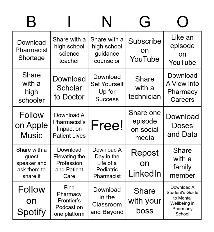 This bingo card has a free space and 28 words: Share with a family member, Share with a pharmacist, Share with a technician, Share with your boss, Share with a high schooler, Share with a high school guidance counselor, Share with a high school science teacher, Share with a guest speaker and ask them to share it, Share one episode on social media, Follow on Spotify, Follow on Apple Music, Subscribe on YouTube, Find Pharmacy Frontierβs Podcast on one platform, Download In the Classroom and Beyond, Download A View into Pharmacy Careers, Download Off the Script, Download Elevating the Profession and Patient Care, Download Scholar to Doctor, Download Set Yourself Up for Success, Download A Day in the Life of a Pediatric Pharmacist, Download Pharmacist Shortage, Download Behind the Counter, Download A Student's Guide to Mental Wellbeing in Pharmacy School, Download A Pharmacist's Impact on Patient Lives, Download Doses and Data, Repost on LinkedIn, Like an episode on YouTube and Share with a friend.