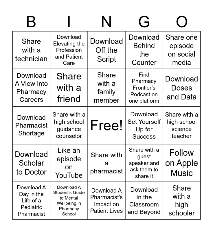 This bingo card has a free space and 28 words: Follow on Apple Music, Subscribe on YouTube, Find Pharmacy Frontier’s Podcast on one platform, Download In the Classroom and Beyond, Download A View into Pharmacy Careers, Download Off the Script, Download Elevating the Profession and Patient Care, Download Scholar to Doctor, Download Set Yourself Up for Success, Download A Day in the Life of a Pediatric Pharmacist, Download Pharmacist Shortage, Download Behind the Counter, Download A Student's Guide to Mental Wellbeing in Pharmacy School, Download A Pharmacist's Impact on Patient Lives, Download Doses and Data, Repost on LinkedIn, Like an episode on YouTube, Share with a friend, Share with a family member, Share with a pharmacist, Share with a technician, Share with your boss, Share with a high schooler, Share with a high school guidance counselor, Share with a high school science teacher, Share with a guest speaker and ask them to share it, Share one episode on social media and Follow on Spotify.