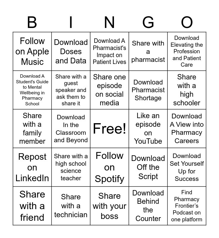 This bingo card has a free space and 28 words: Download Set Yourself Up for Success, Download A Day in the Life of a Pediatric Pharmacist, Download Pharmacist Shortage, Download Behind the Counter, Download A Student's Guide to Mental Wellbeing in Pharmacy School, Download A Pharmacist's Impact on Patient Lives, Download Doses and Data, Repost on LinkedIn, Like an episode on YouTube, Share with a friend, Share with a family member, Share with a pharmacist, Share with a technician, Share with your boss, Share with a high schooler, Share with a high school guidance counselor, Share with a high school science teacher, Share with a guest speaker and ask them to share it, Share one episode on social media, Follow on Spotify, Follow on Apple Music, Subscribe on YouTube, Find Pharmacy Frontierβs Podcast on one platform, Download In the Classroom and Beyond, Download A View into Pharmacy Careers, Download Off the Script, Download Elevating the Profession and Patient Care and Download Scholar to Doctor.