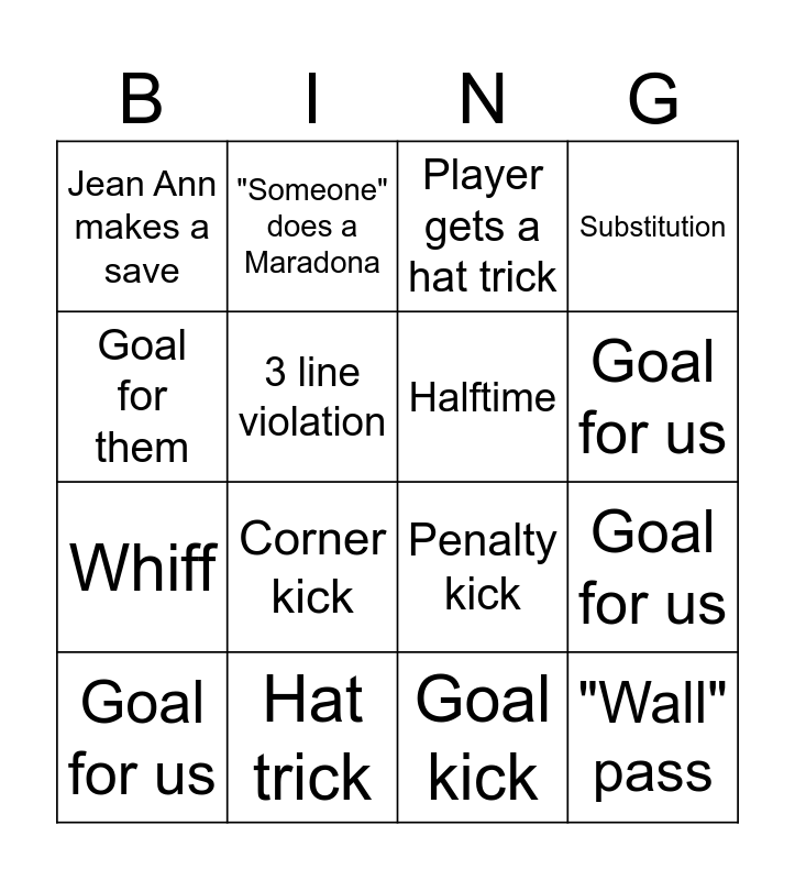 This bingo card has 20 words: Goal for us, Goal for them, Player gets a hat trick, Free!, Goal for us, Goal for them, Hat trick, Jean Ann makes a save, Whiff, "Someone" does a Maradona, Corner kick, Penalty kick, 3 line violation, "Wall" pass, Halftime, Goal for them, Goal for us, Substitution, Goal kick and Blue card.
