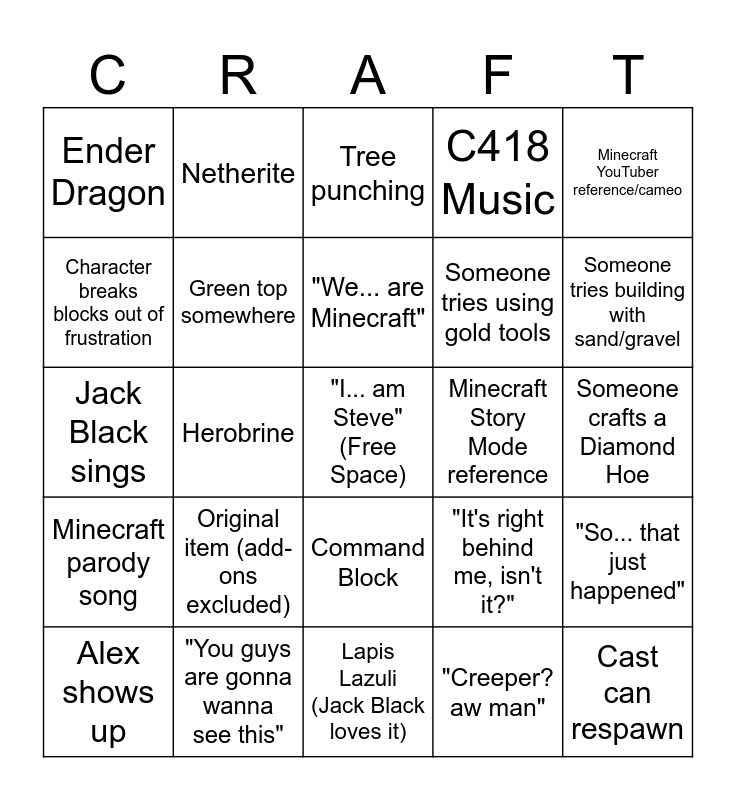 Minecraft Movie Bingo | Minecraft Movie Bingo | A Minecraft Movie Bingo Card | Minecraft Movie | Mine craft