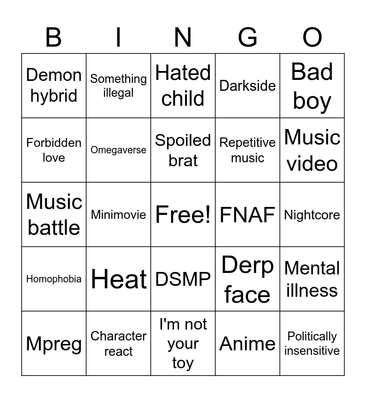 This bingo card has a free space and 24 words: Heat, Character react, Spoiled brat, Mpreg, Bad boy, Demon hybrid, Forbidden love, Something illegal, FNAF, DSMP, Repetitive music, Music battle, Derp face, Mental illness, Omegaverse, Anime, Nightcore, Hated child, Music video, Minimovie, Politically insensitive, Homophobia, Darkside and I'm not your toy.
