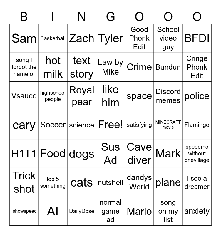 This bingo card has a free space and 48 words: dandys World, Bundun, normal game ad, Soccer, Royal pear, Flamingo, Basketball, AI, School video guy, Sus Ad, BFDI, Tyler, Discord memes, space, Trick shot, MINECRAFT movie, song I forgot the name of, Cringe Phonk Edit, plane, Good Phonk Edit, Crime, science, Sam, hot milk, I see a dreamer, text story, police, Ishowspeed, like him, highschool people, song on my list, satisfying, speedmc without onevillage, top 5 something, cary, Cave diver, Mark, Vsauce, dogs, cats, H1T1, anxiety, Zach, DailyDose, Law by Mike, nutshell, Food and Mario.