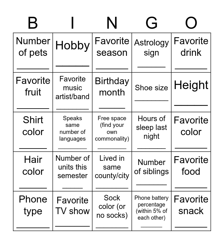 This bingo card has a free space and 24 words: Number of units this semester _____, Favorite TV show _______, Birthday month _____, Phone type ______, Favorite drink ______, Number of pets ______, Favorite fruit ______, Hobby _____, Hours of sleep last night _______, Lived in same county/city ________, Shoe size ________, Shirt color _____, Number of siblings _______, Favorite food ______, Favorite music artist/band ________, Phone battery percentage (within 5% of each other) _______, Favorite color ______, Favorite season ______, Height _____, Speaks same number of languages _________, Favorite snack ______, Hair color _____, Astrology sign ______ and Sock color (or no socks) ________.