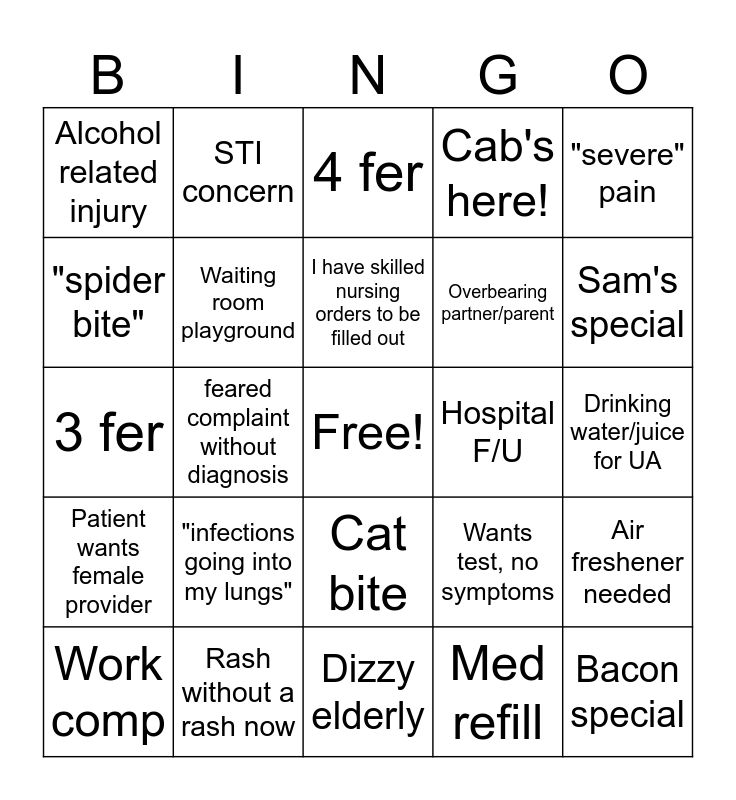 This bingo card has a free space and 44 words: "lethargy", Bacon special, Needs note, Work comp, Critical lab result, Med refill, 4 fer, Tooth infection, "severe" pain, Rash without a rash now, Cab's here!, Hospital F/U, Cat bite, "infections going into my lungs", "ongoing" cough, etc, Dizzy elderly, "Swallowing razor blades", 3 fer, Prior auth, Sam's special, STI concern, Positive home pregnancy test, "prophylactic antibitoic plz", Alcohol related injury, "My relative who works in healthcare says...", Drinking water/juice for UA, I just want a referral, "don't have time to be sick", Wants test, no symptoms, Patient wants female provider, "my snot is green", Air freshener needed, COM cor, "sick", feared complaint without diagnosis, last minute x ray or lac, Chief complaint not true chief complaint, New DM diagnosis no PCP, I have skilled nursing orders to be filled out, "spider bite", Overbearing partner/parent, Pt talking nonstop during auscultation, Waiting room playground and "I took a picture".